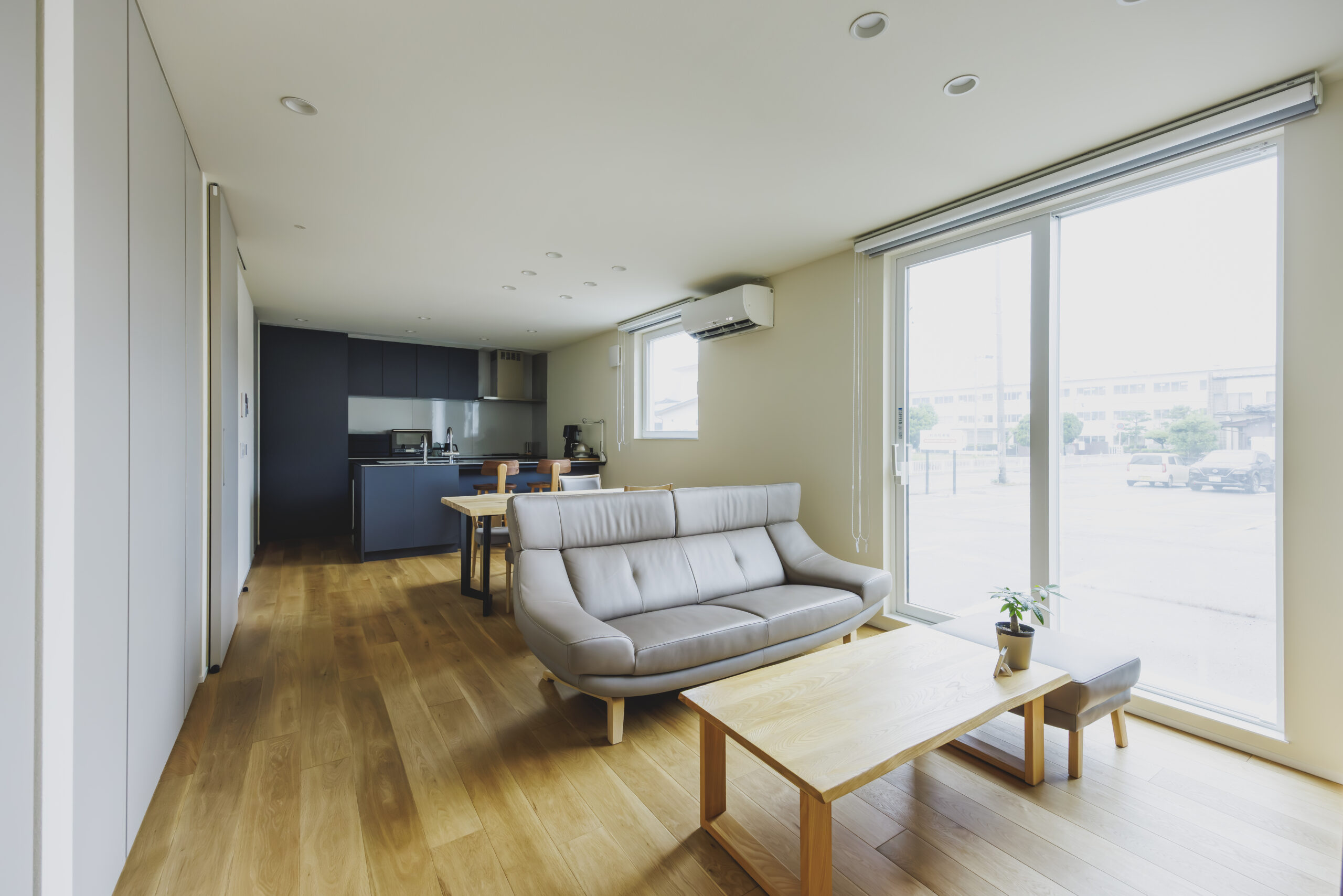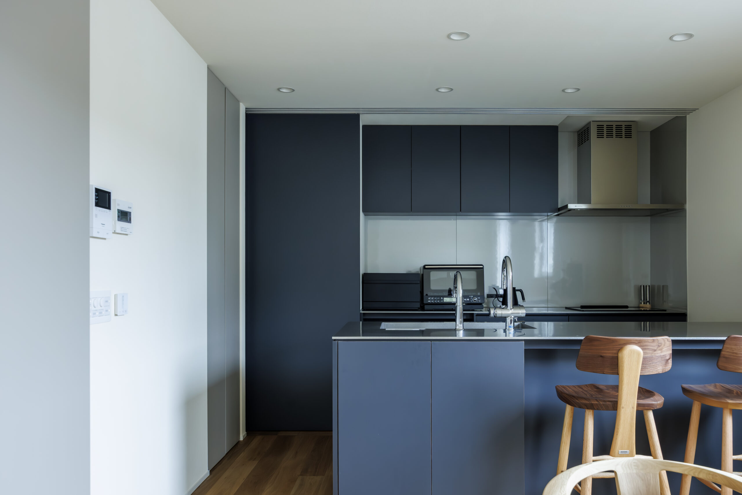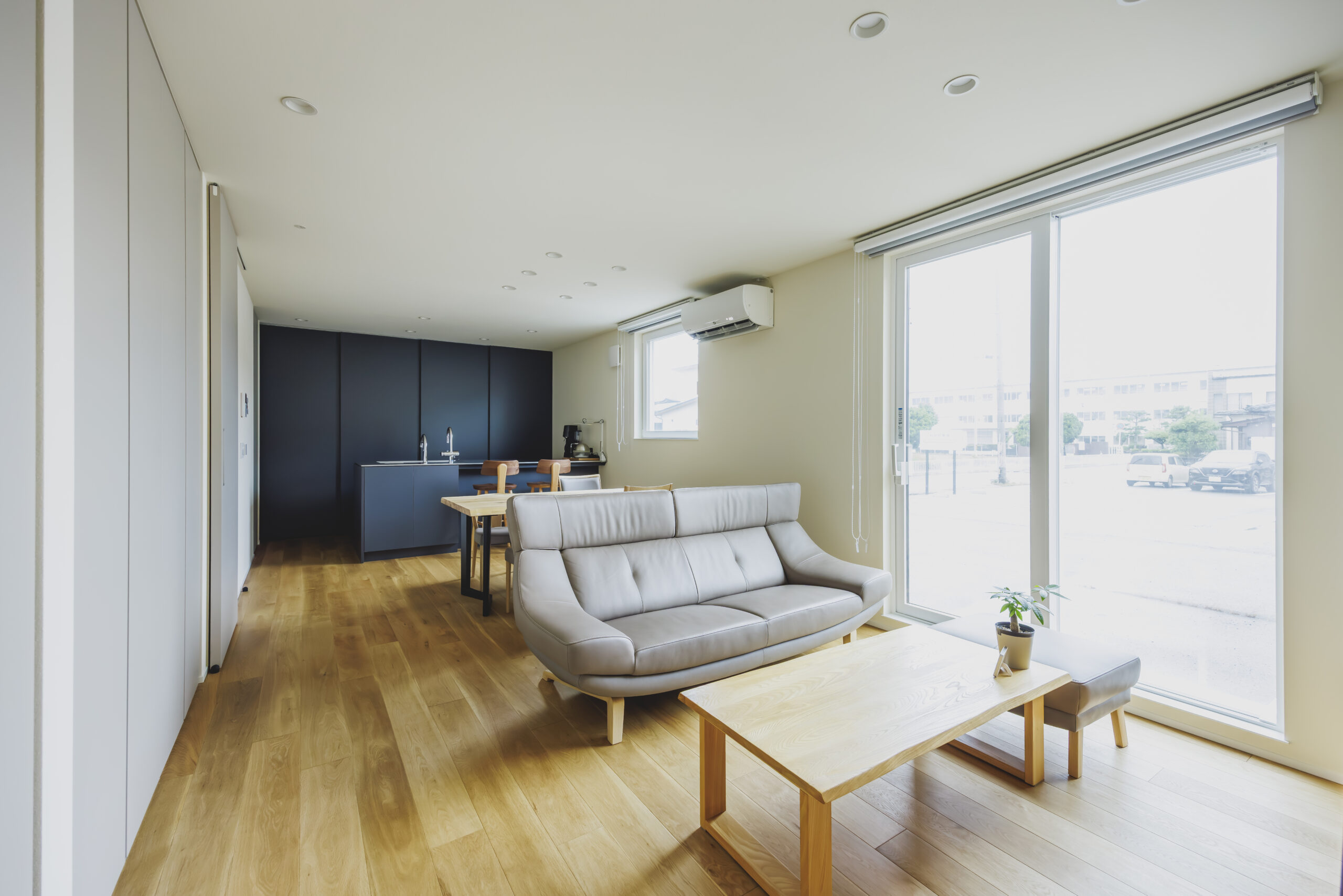 福井市_W様邸 統一感のある色合わせ、たくさんの収納により、スタイリッシュでスマートな生活が送れる理想の空間となっています。 すっきり整った暮らしができる理想の平屋です。 ↑キッチンの扉を開けた状態 ↑キッチンの扉を閉めた状態 生活感が出ず、すっきりした空間になります。