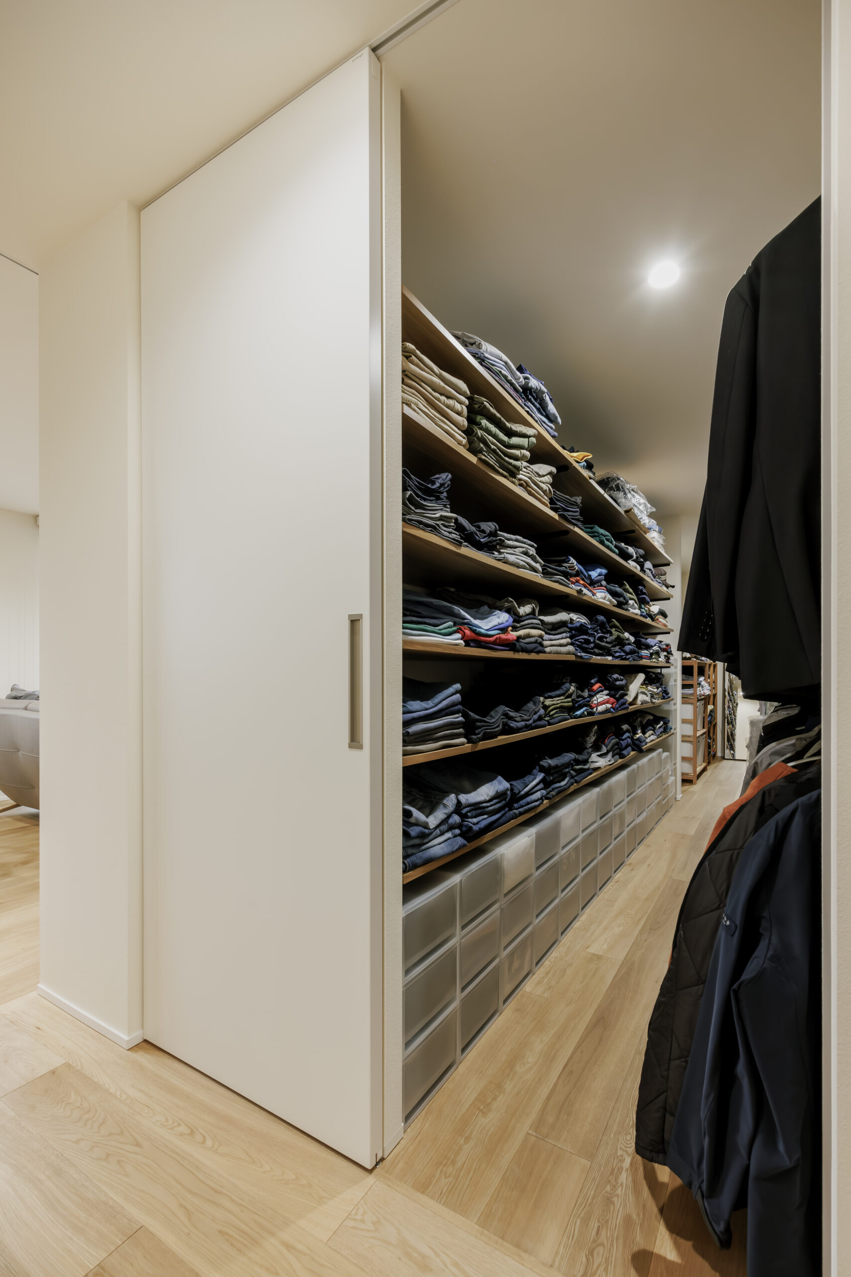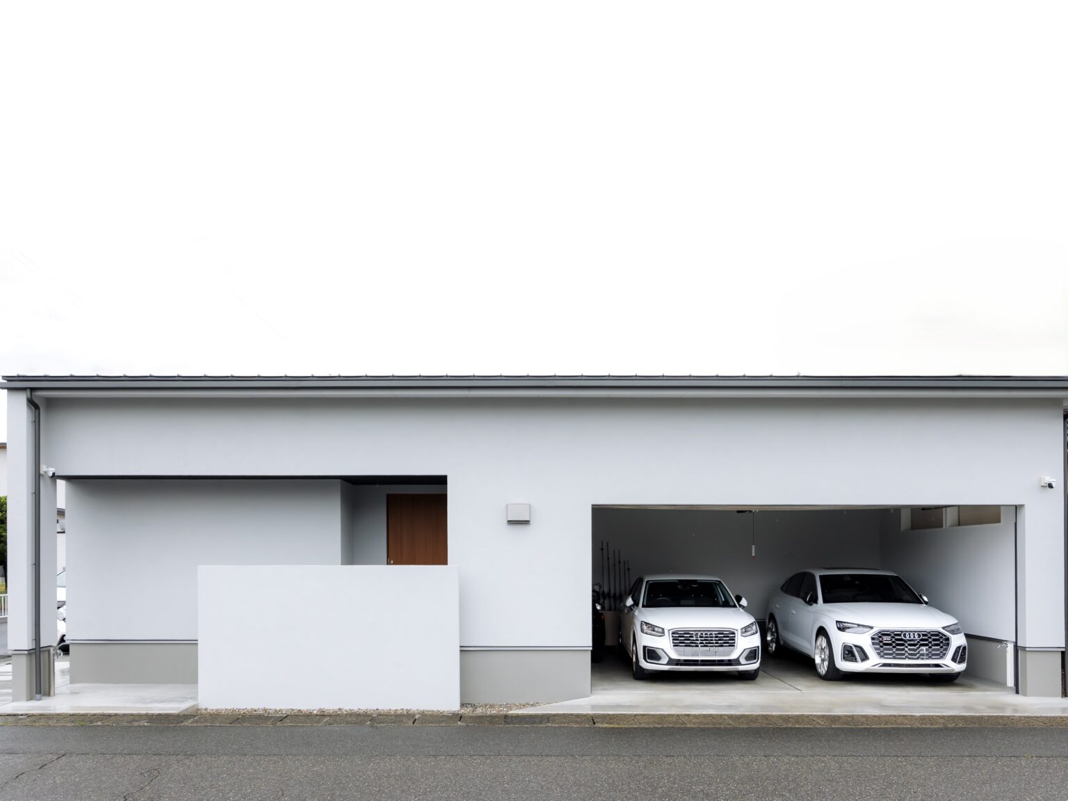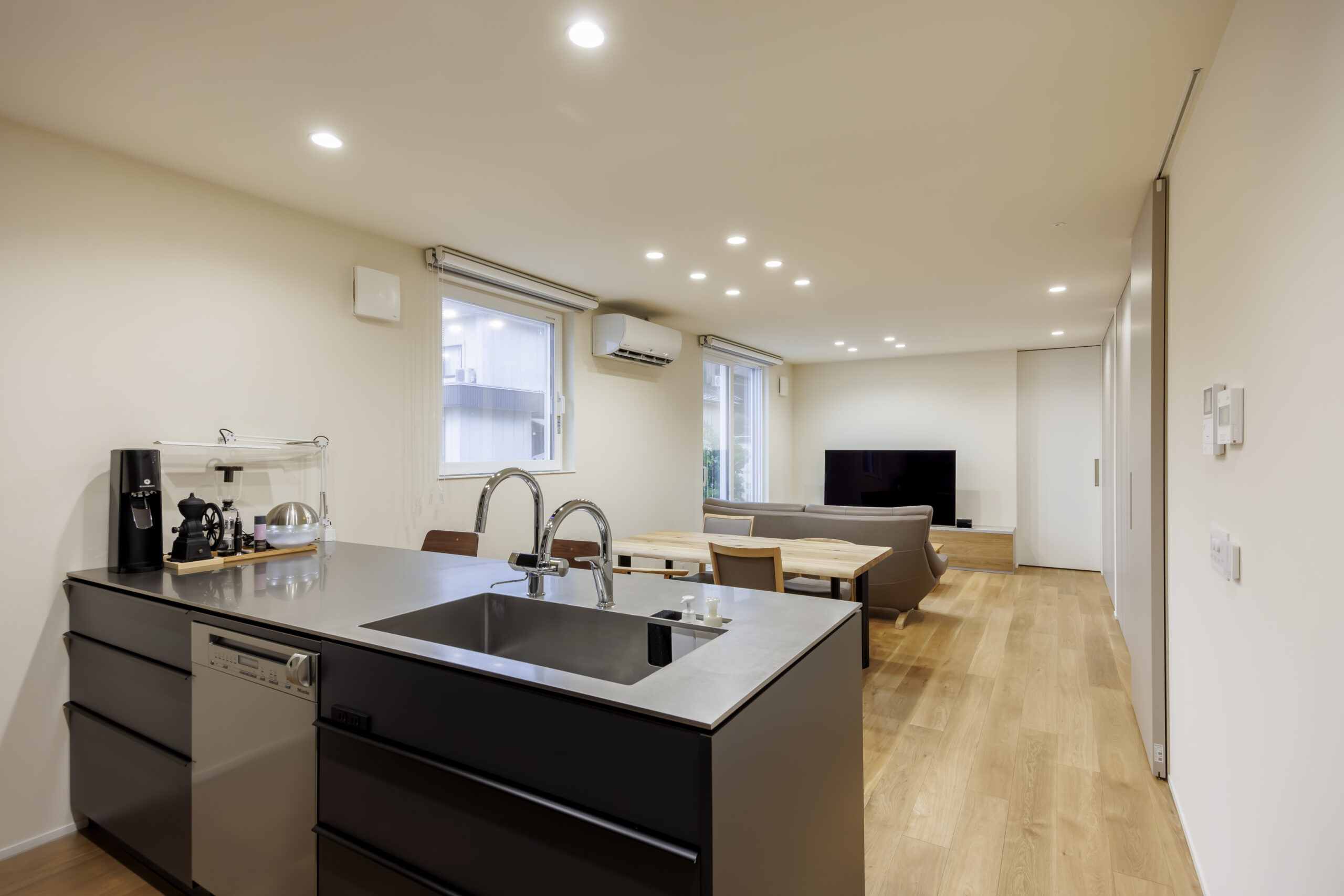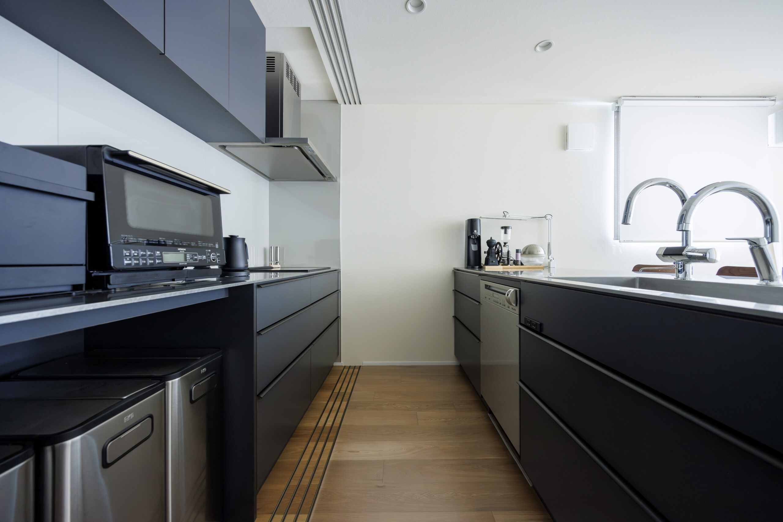 福井市_W様邸 統一感のある色合わせ、たくさんの収納により、スタイリッシュでスマートな生活が送れる理想の空間となっています。 すっきり整った暮らしができる理想の平屋です。 ↑キッチンの扉を開けた状態 ↑キッチンの扉を閉めた状態 生活感が出ず、すっきりした空間になります。