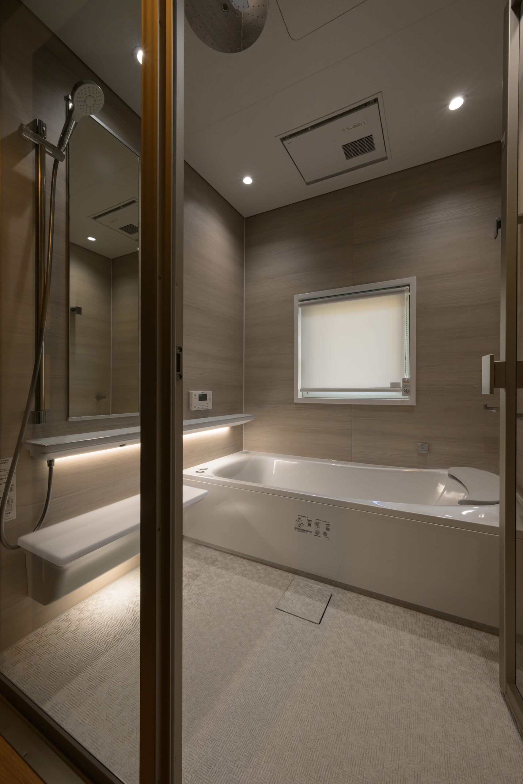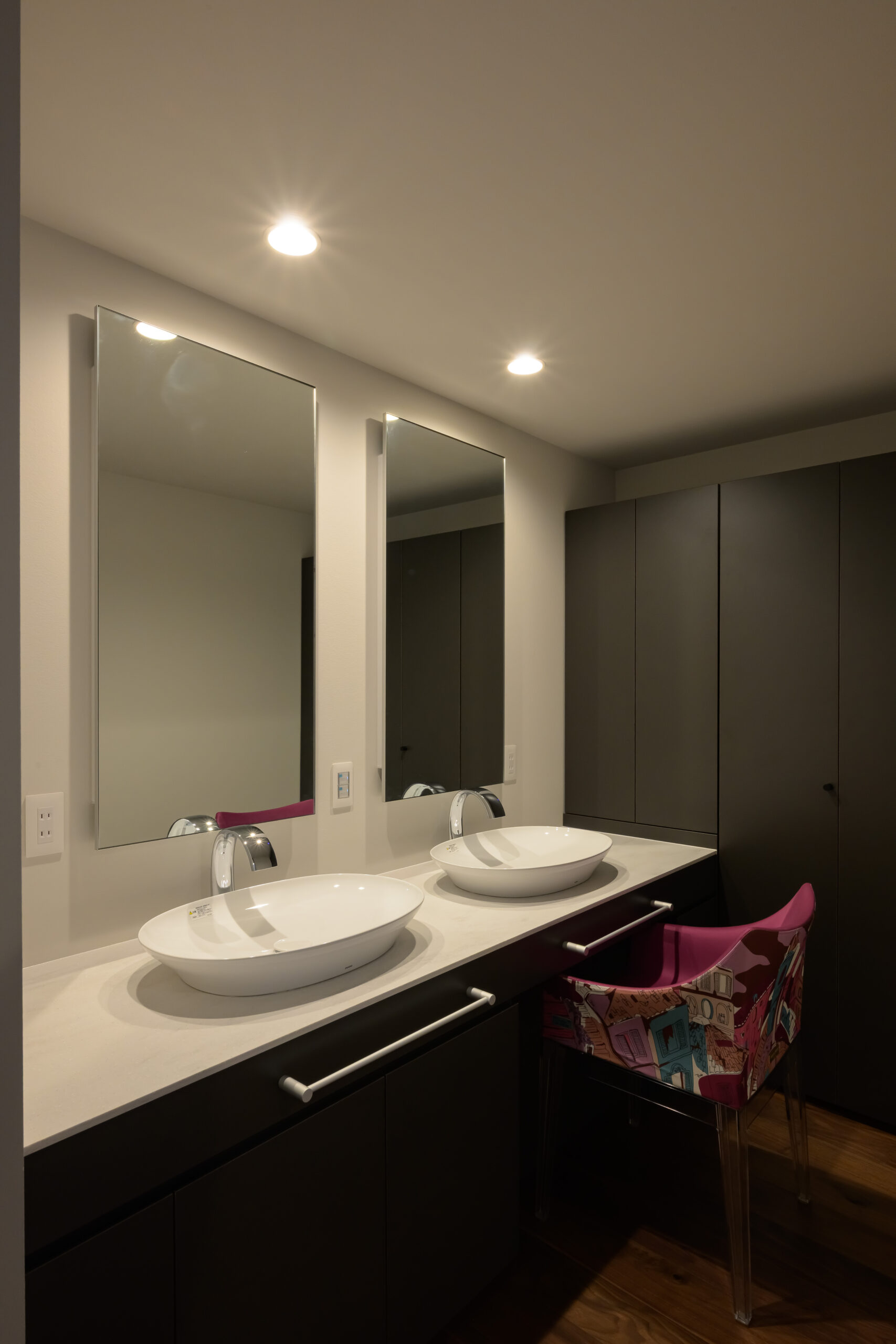 洗面スペースは、二人並んで使えるので、朝の忙しい時間もストレスフリー。おしゃれで広々したホテルライクな空間です。